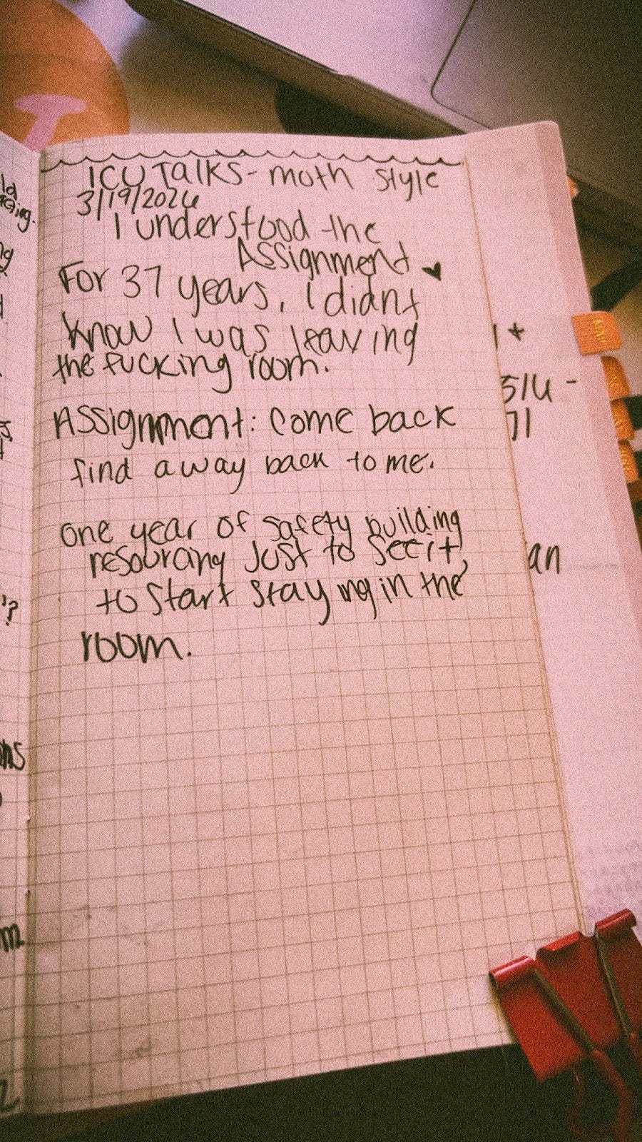 I wrote it on my hand because I had never been on that stage before and I needed something to orient me if I started to leave my body and mind. I’ve been leaving rooms my whole life without knowing I was doing it. Dissociation doesn’t feel like leaving. It feels like nothing, which is the point. You don’t know you’re gone until someone hands you a map back and you realize you haven’t been in your own body in decades.